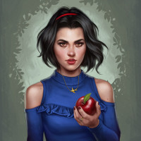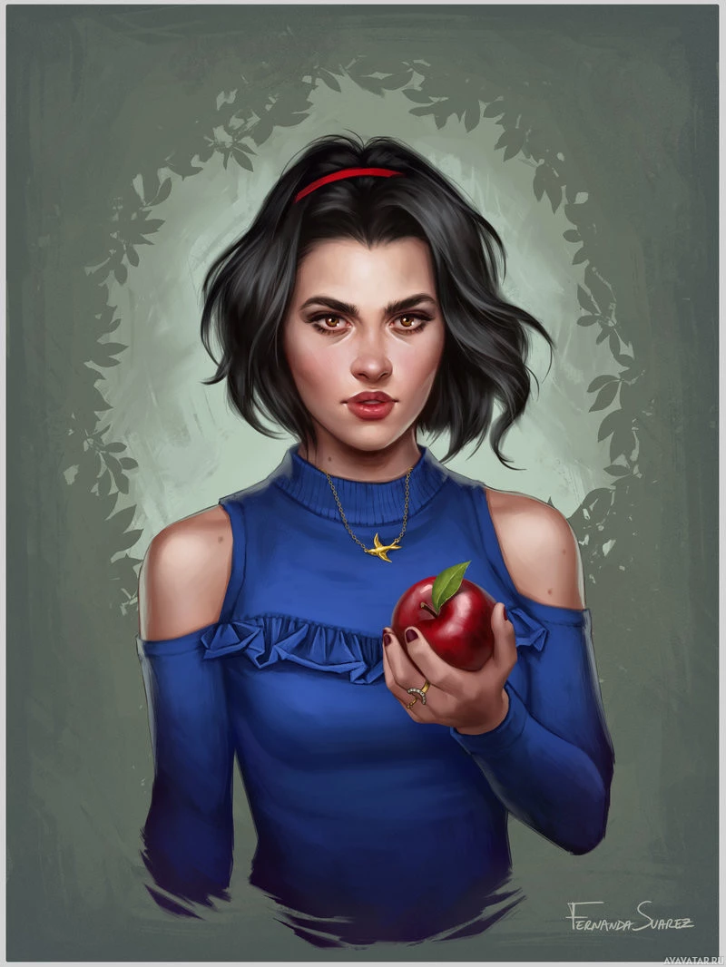 a contemplative expression and is holding an apple in her right hand, which she's gazing at thoughtfully. Her attire includes