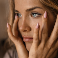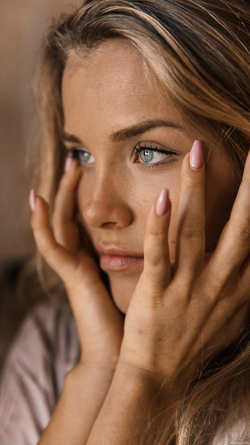 На картинке изображена молодая женщина со светлыми волосами, выглядящая задумчивой или, возможно, расстроенной. Она нарисовала ногти и задумчиво прижимает кончики пальцев к лбу. Ее взгляд немного отведен от камеры. Фоновый фон является нейтральным и не обеспечивает какого-либо значимого контекста об обстановке или окружающей среде.
