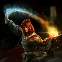 robe with a hood, which adds to the mystical and magical theme of the artwork. The character's hand is extended, seemingly casting a spell with glowing sparks flying around it, suggesting