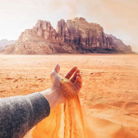 The image shows a person's hand holding a clump of orange sand, which is commonly found in