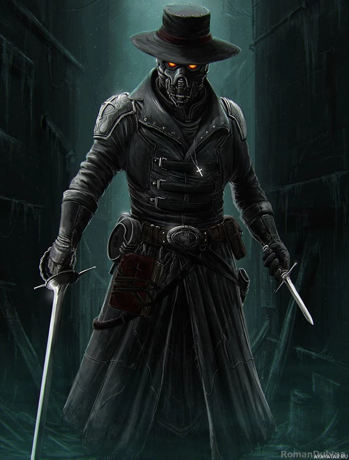 The image depicts a character wearing a black hat and mask, with