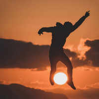 a silhouette of a person jumping into the air against a beautiful sunset. The individual appears to be captured in mid-jump, with arms spread wide and legs bent at the knees for balance. The background is lit by the warm hues of
