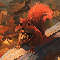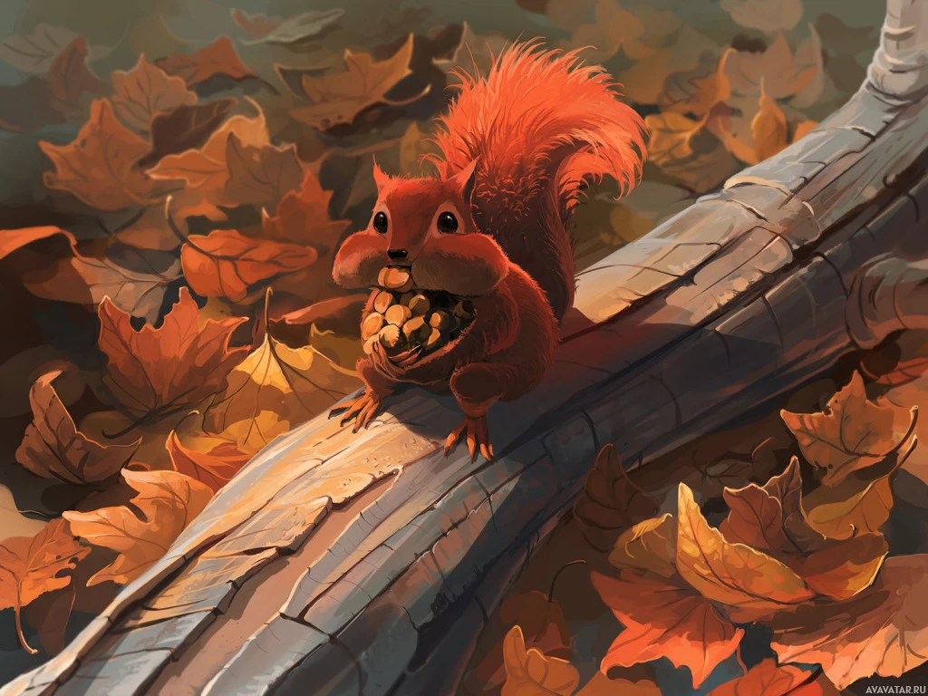 the fall season when they often collect food for winter. The background suggests it's autumn with fallen leaves and trees that are likely in