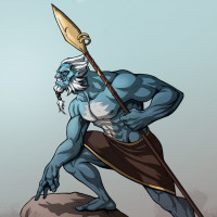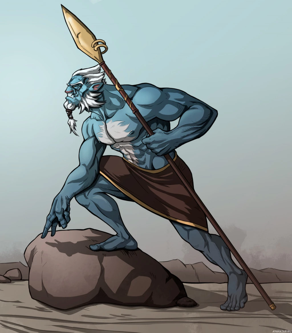 На картинке изображен анимированный персонаж из игры «Dota 2», известный как Phantom Lancer. Он показан в динамической позе, опираясь на копье и находясь в состоянии интенсивного сосредоточения или готовности к бою. Персонаж имеет отличительную сине-белую цветовую схему с заметной бородой и усами, которые являются характерными чертами дизайна Phantom Lancer.