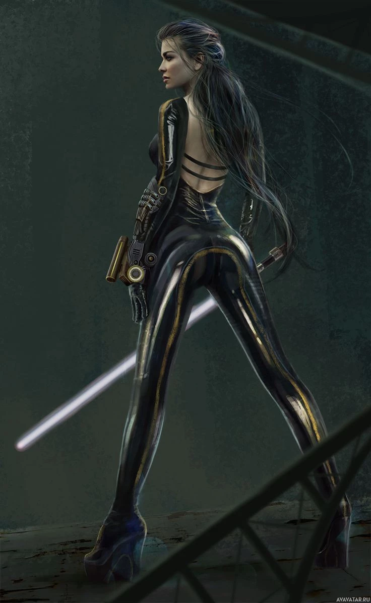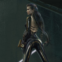 a female warrior or assassin. She is wearing a black and gold bodysuit with mechanical elements, including