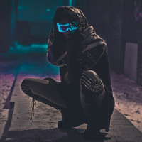 a person in the foreground, crouched down with their head covered by a hood and wearing what appears to be futuristic or cyberpunk-inspired clothing. The outfit includes a high collar and details that could suggest advanced