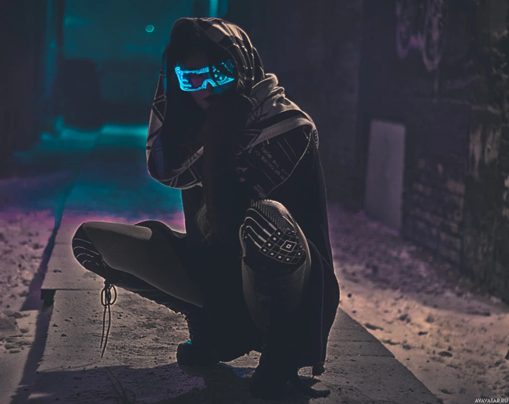 science fiction or dystopian themes conveyed by the attire and ambiance of the photo.