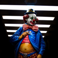 The image shows a clown. The clown appears to be a statue or sculpture, not