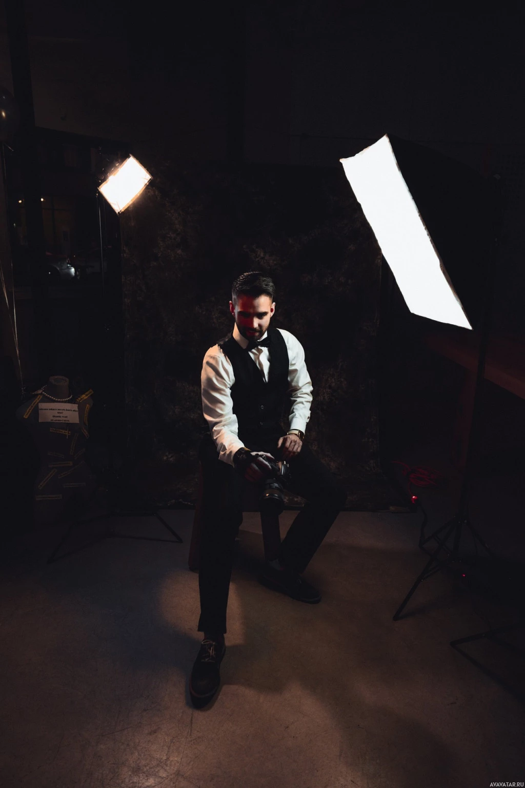 dark hair styled in a slicked-back fashion. They are seated in front of a camera on a set that looks like it could be for a photography or filming session. The background is blurred, but there are some lights and reflectors visible, indicating the professional setup of