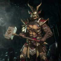 This image depicts a character from the video game Mortal Kombat. The character is holding a hammer and wearing armor that includes spikes and what appears to be a helmet with antlers, giving them an intimidating appearance. The background suggests a battle or combat arena setting typical for the Mortal Kombat series.