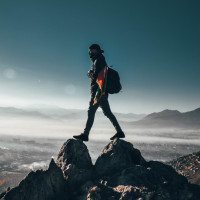 mountain peak at sunrise or sunset, given the warm light in the sky. The person appears to be looking out towards the horizon with their hands in their pockets. They are wearing a backpack, which suggests they might be hiking or traveling. There is also some mist or fog near the ground, adding to the serene and dramatic