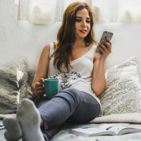 a cup of coffee or tea next to her, suggesting she might be enjoying a relaxed moment with her drink. She is looking at