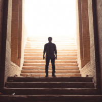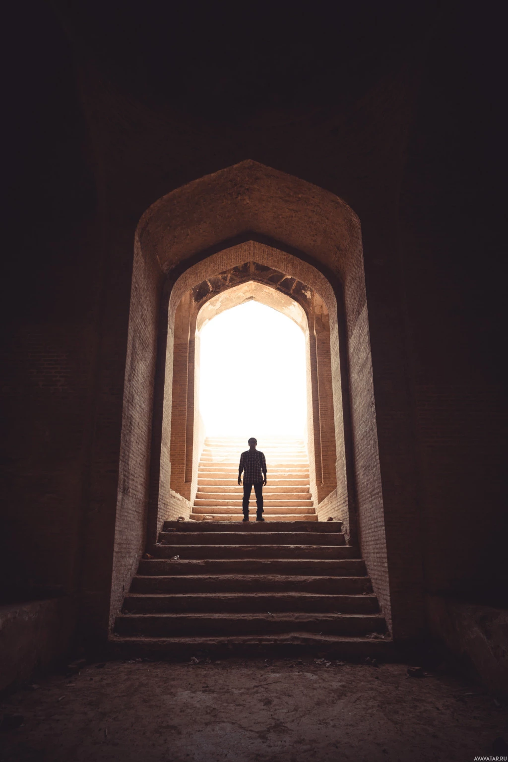 a silhouette of a person standing at the top of some steps leading into a dark, arched passageway or tunnel. The setting appears to be an ancient or historical structure, possibly a temple or