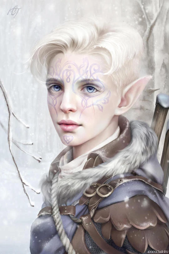 a fantasy character, who appears to be an elf. The elf has light-colored hair and pointed ears, which are common characteristics in
