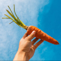 The picture shows a hand holding two carrots with their green tops attached. The background is clear and blue, suggesting an outdoor setting, possibly on a sunny day given the shadows cast.