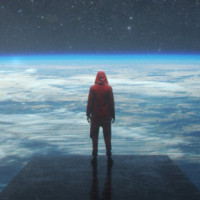 a red cloak, and it seems as though they are looking out towards Earth. The setting has a futuristic or science fiction vibe, with