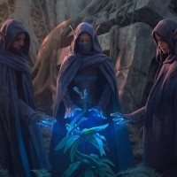 a fantasy setting, specifically what appears to be elves. They are dressed in dark robes and hoods with