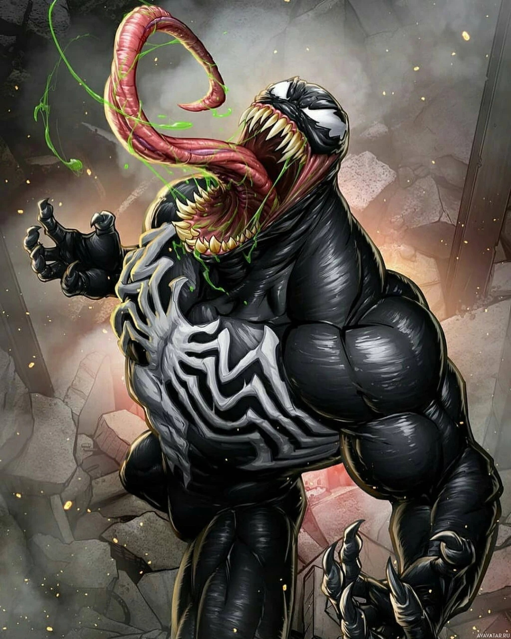 black suit with white spots and the symbiote that bonds with him to give him superhuman abilities such as enhanced strength, agility, and durability. In this image, Venom appears to be in a state of intense battle or confrontation, as indicated by his wide-