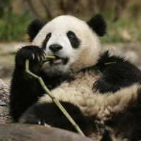 The image shows a panda lying on its back, with one of its forepaws raised to its mouth as if it is eating. It appears to be in an outdoor setting, possibly a natural habitat or a controlled environment designed to mimic such a habitat.