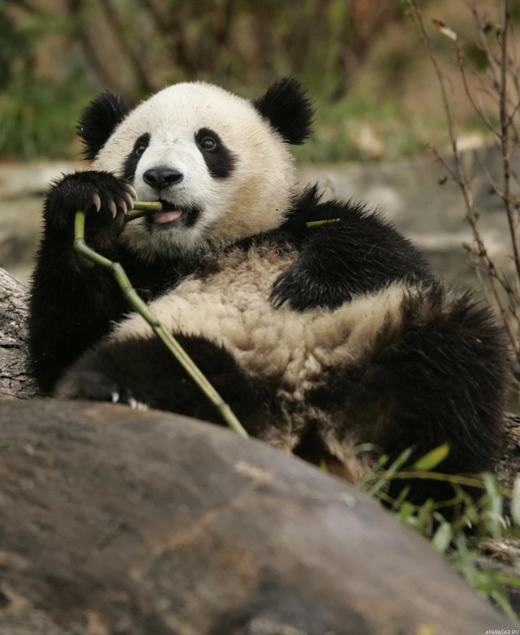 На картинке изображена панда, лежащая на спине, с одной из передних лап, поднятой ко рту, как будто она ест. Похоже, что он находится на открытом воздухе, возможно, в естественной среде обитания или контролируемой среде, предназначенной для имитации такой среды обитания.