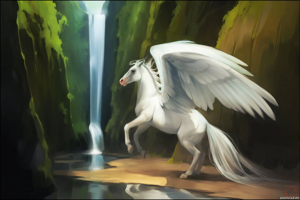 wings of a bird, specifically resembling an angelic or mythical representation, while the lower body, including legs and hooves, is that of a horse. This creature stands in