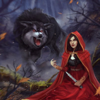 Riding Hood costume. This character is seated on the ground, holding what appears to be a knife with both hands as if she is preparing to defend herself or someone else nearby. In the background, there is a large wolf that is positioned menacingly with its mouth open and teeth visible, giving an impression of