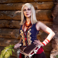 blonde hair styled in a manner that complements her character-inspired outfit. The background suggests