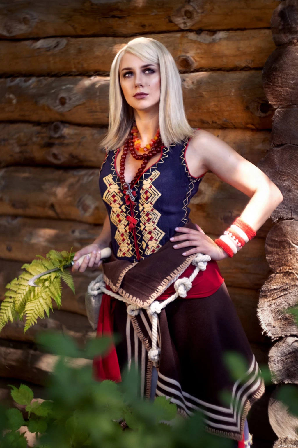 The image depicts a woman dressed in what appears to be costume inspired by the Witcher