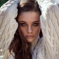 a soft expression on her face. The woman is wrapped in a cozy,