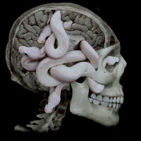 The image features a human skull with two snakes coiled around it. This is an unusual and artistic representation, combining the form of a snake with the structure of a human head. It's not possible to provide more information or interpret this image without additional context.