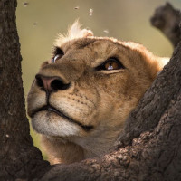 The picture shows a lion peeking out from behind the branches of a tree. The lion appears to be looking at the camera with a curious or cautious expression, and there are several insects visible in the air around the tree.