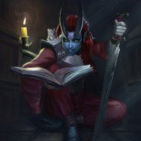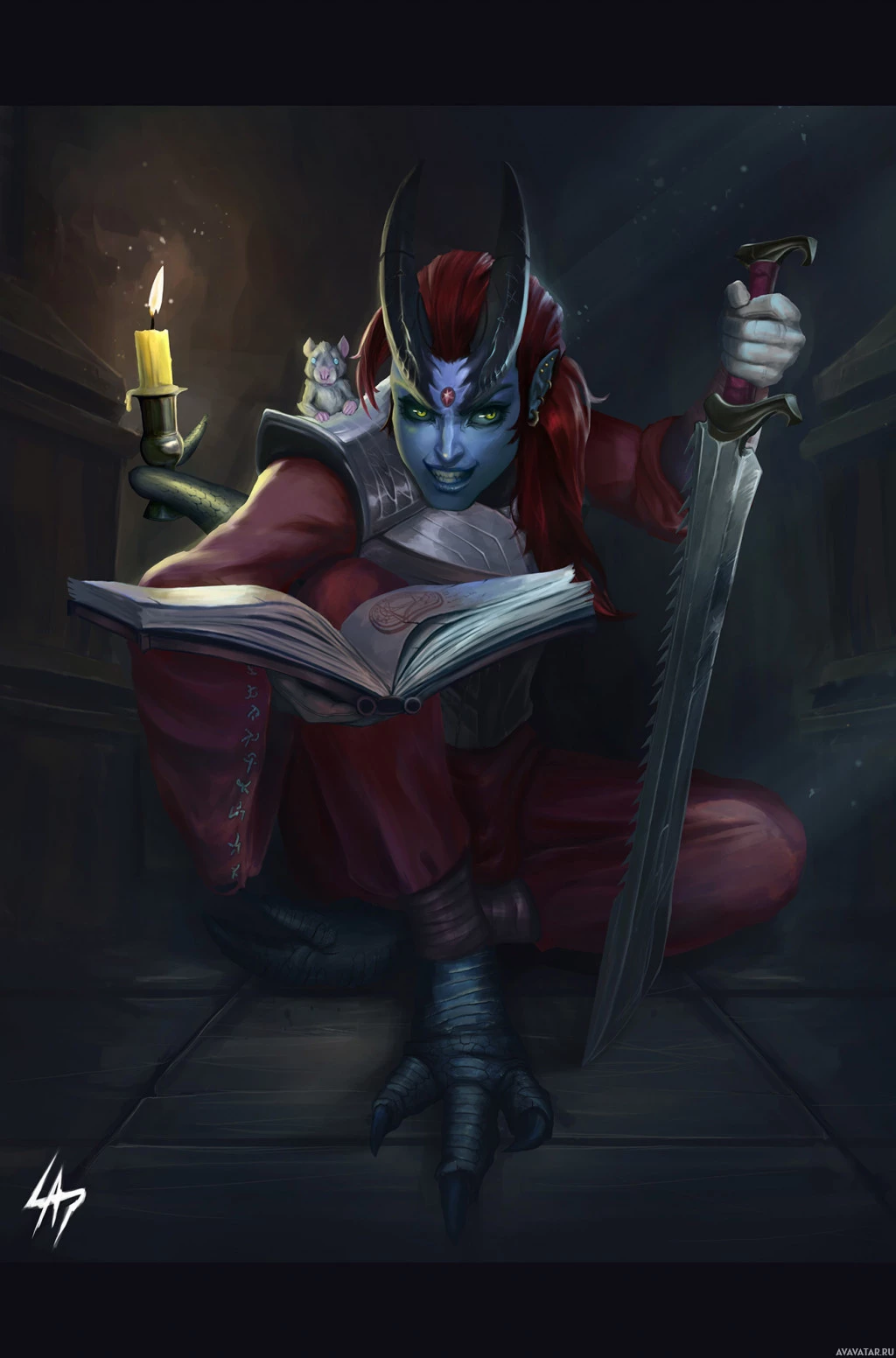 The image depicts a fantasy-themed character. This character is holding a book and has a sword in her hand, suggesting she might be involved in some kind of magical or