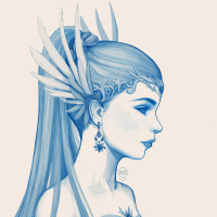 blue hair and is wearing elaborate headdresses that resemble fish scales or feathers, giving her an ethereal or mystical appearance. Additionally, she is adorned with what appears to be jewelry and body paint, contributing to a fantasy-themed look. The artwork has a high