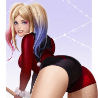 Harley Quinn, a fictional character from the DC Comics universe. She is depicted in her typical costume with red shorts and