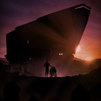 a desert environment, which aligns with the planet Tatooine from the Star Wars universe. The artwork captures the essence of the film's