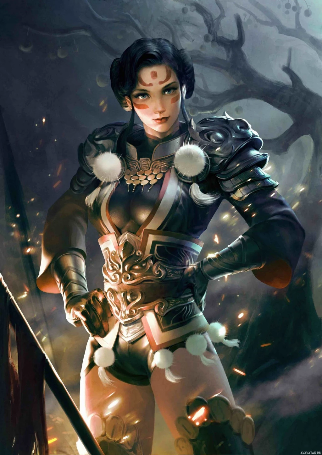 dark hair and is wearing armor with a distinctive design, including what looks like wolf ears as part of the helmet. Her pose suggests confidence and readiness for battle. The background features an ominous,