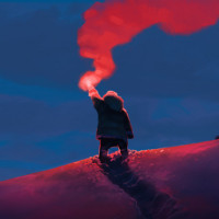 winter clothing and are holding something that is emitting smoke, which could be a campfire or some kind of flame. The background shows the silhouette of trees, suggesting this might be in