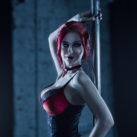 red hair, a black corset, and lingerie that is primarily in dark colors with hints of red. The setting appears to be