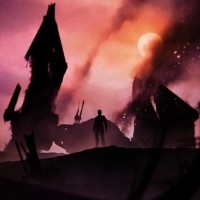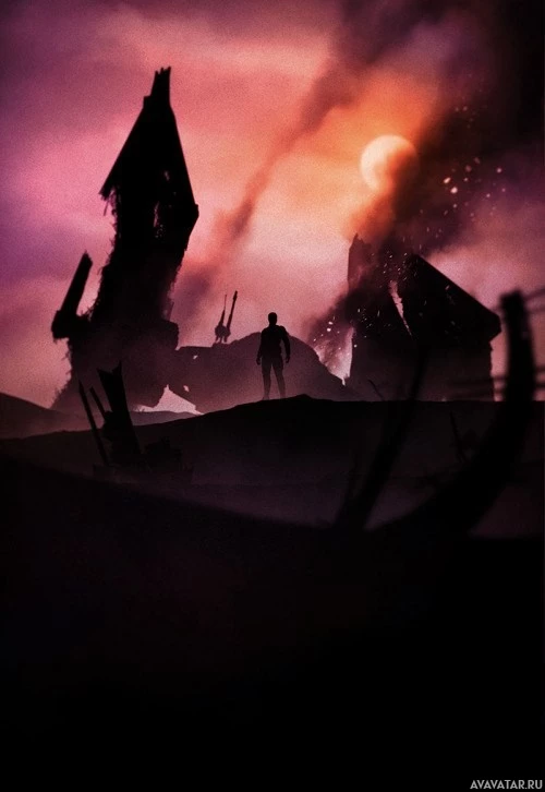 a barren landscape with ruins in the background. In the distance, there are structures and other figures that appear damaged or in disrepair. The sky has an ominous orange hue, suggesting either sunrise or