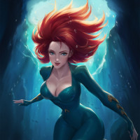 The image depicts an illustration of a female character with red hair, wearing a blue aquatic costume. She appears to be in motion, possibly underwater given the water droplets and her positioning. The style is reminiscent of comic book or animated artwork.