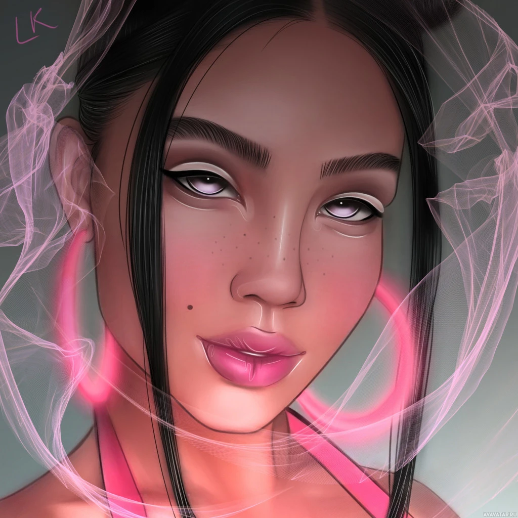 long hair, is wearing makeup including pink eyeshadow and lipstick, and is accessorized with pink earrings that have a futuristic design. The woman's expression is neutral to slightly contemplative, and she appears to be in her late teens or