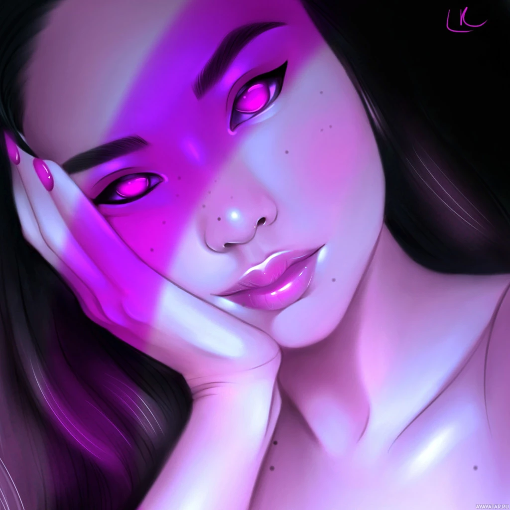 На картинке изображена иллюстрированная девушка с фиолетовым свечением, исходящим от ее лица, особенно вокруг глаз и рта. У нее темные волосы и она отворачивается от зрителя. Ее рука покоится на щеке в задумчивой или созерцательной позе. В общей цветовой палитре изображения преобладают оттенки фиолетового и розового.
