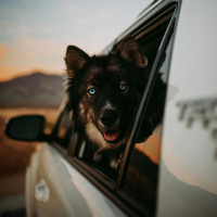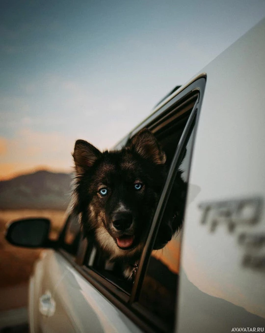 the warm colors in the sky. The dog appears to be enjoying the view and has a distinctive blue-colored eye. It seems like it could be