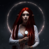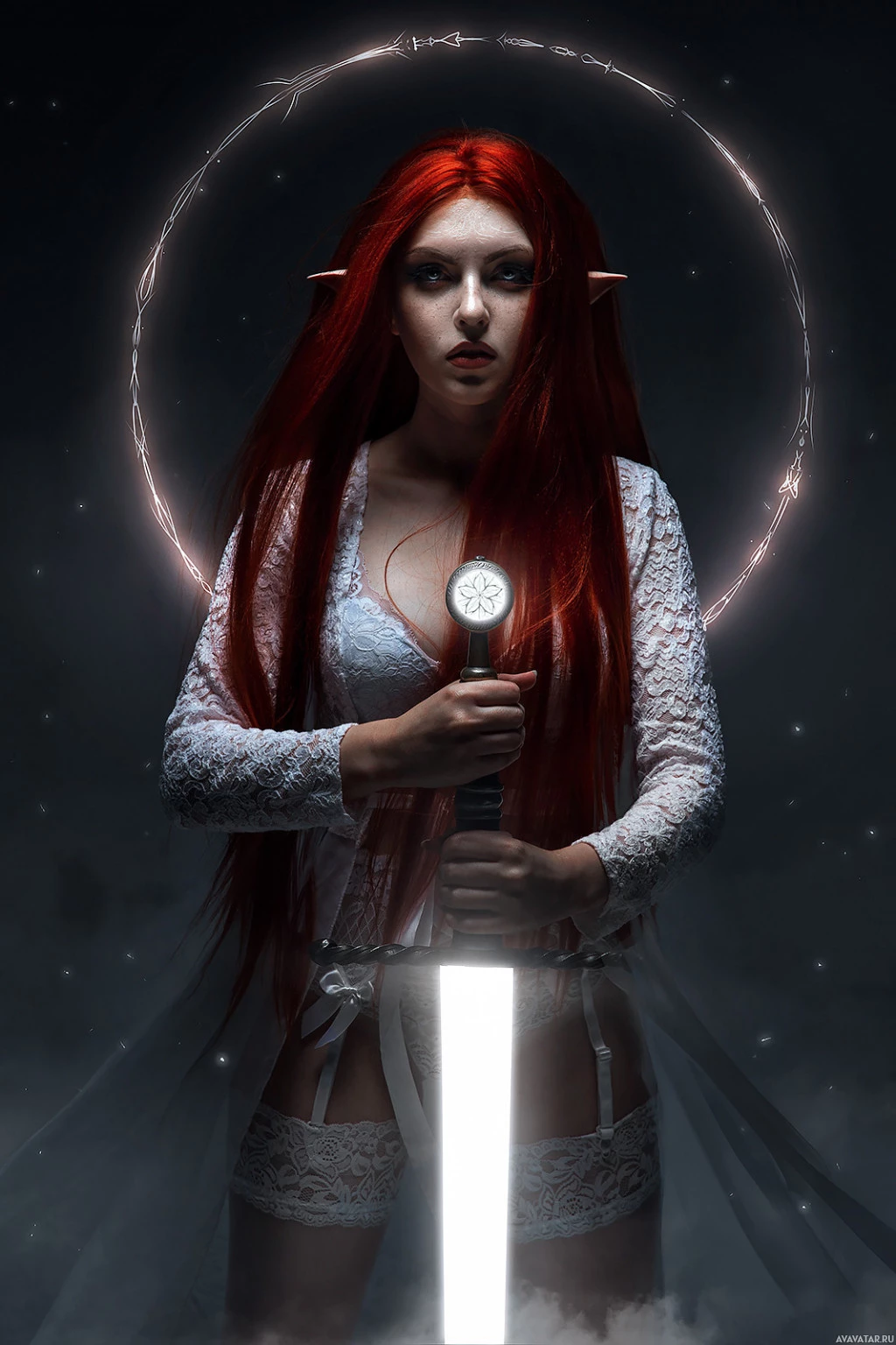 a starry sky and ethereal light effects that add to the otherworldly atmosphere of the image, which aligns with fantasy themes.