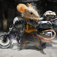 dystopian setting. The mouse character is anthropomorphized and dressed in a protective suit, complete with armor, gloves, and a helmet that resemble