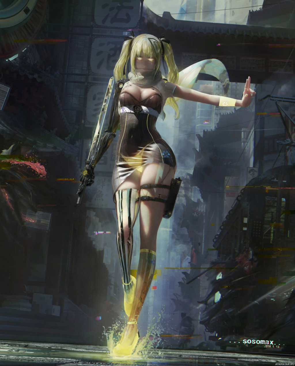 blonde hair and is dressed in an outfit that combines elements of cyberpunk or futuristic design with what looks like armor pieces. Her pose suggests movement, possibly running or jumping, and there are digital effects around her, indicating a high-