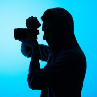 The image shows a silhouette of a person holding a camera. They are taking a photograph, likely capturing an image or recording video. The background appears to be a solid color, possibly blue, and there's no specific detail that suggests the presence of a girl. The image is focused on the action of photography rather than featuring identifiable individuals.