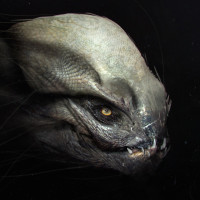 a prominent snout. The creature's mouth is open as if it were roaring or communicating in some way, and its eyes are closed, which may suggest intensity or emotion. This creature is not from real life but is likely an artistic representation for the purpose of storytelling or illustration in
