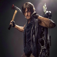 a bow with arrows in the other. He is wearing a vest over a t-shirt, jeans, and boots, giving him a rugged appearance. In the background, there are what appear to be cables or wires running across his torso, suggesting that he might be involved in some sort of