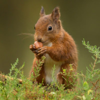 The image shows a red squirrel with a bushy tail standing in what appears to be a woodland or forest environment. The squirrel is engaged in an activity, holding what looks like a piece of food, possibly a nut or fruit, in its paws. The setting includes some vegetation and a fallen tree trunk on the ground nearby.